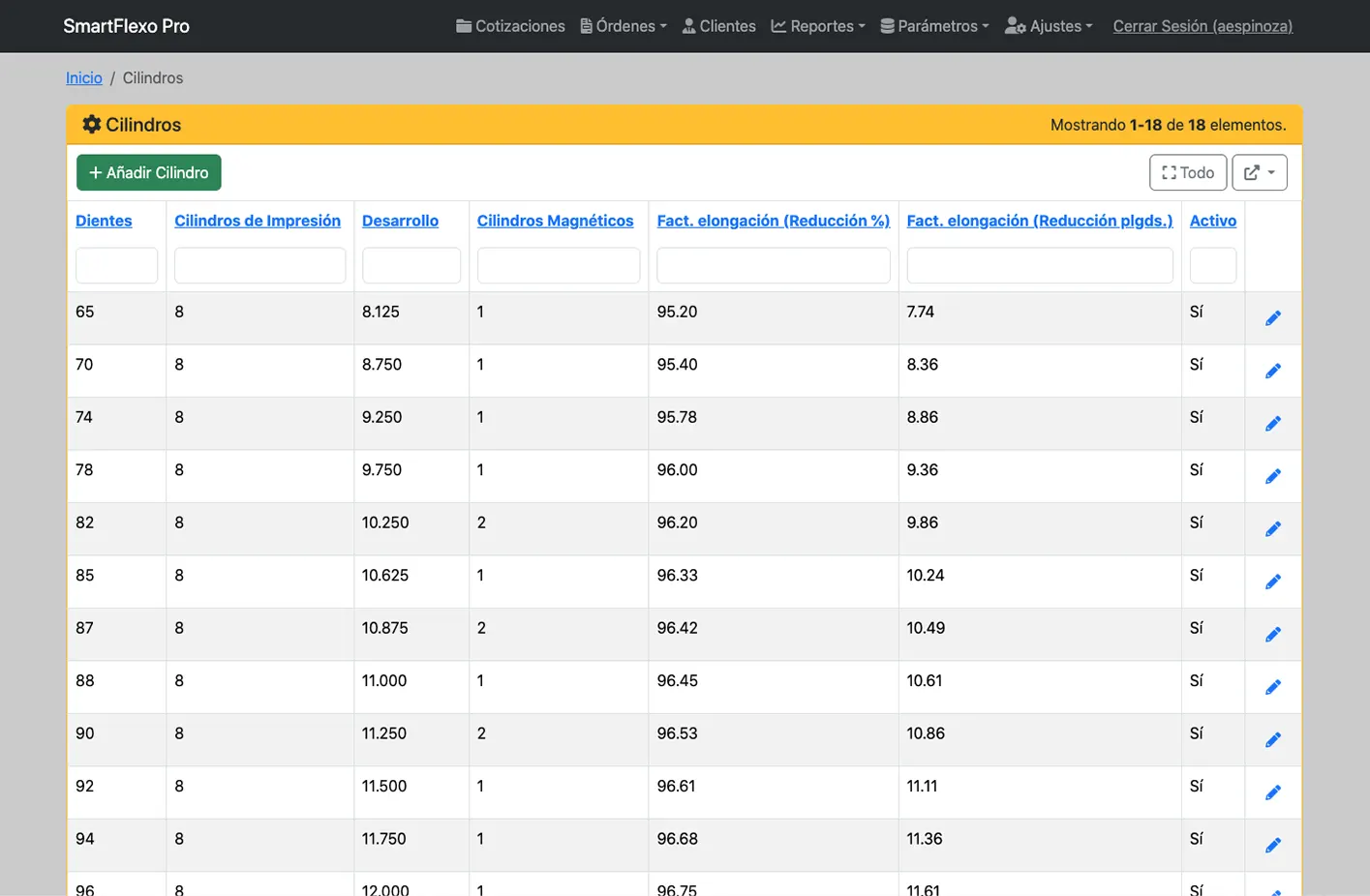 Registrar cada troquel y cilindro asignado a un cliente o a una línea de producción (modelos, dimensiones, número de diente de cilindro, tipo de material, estado actualizado).