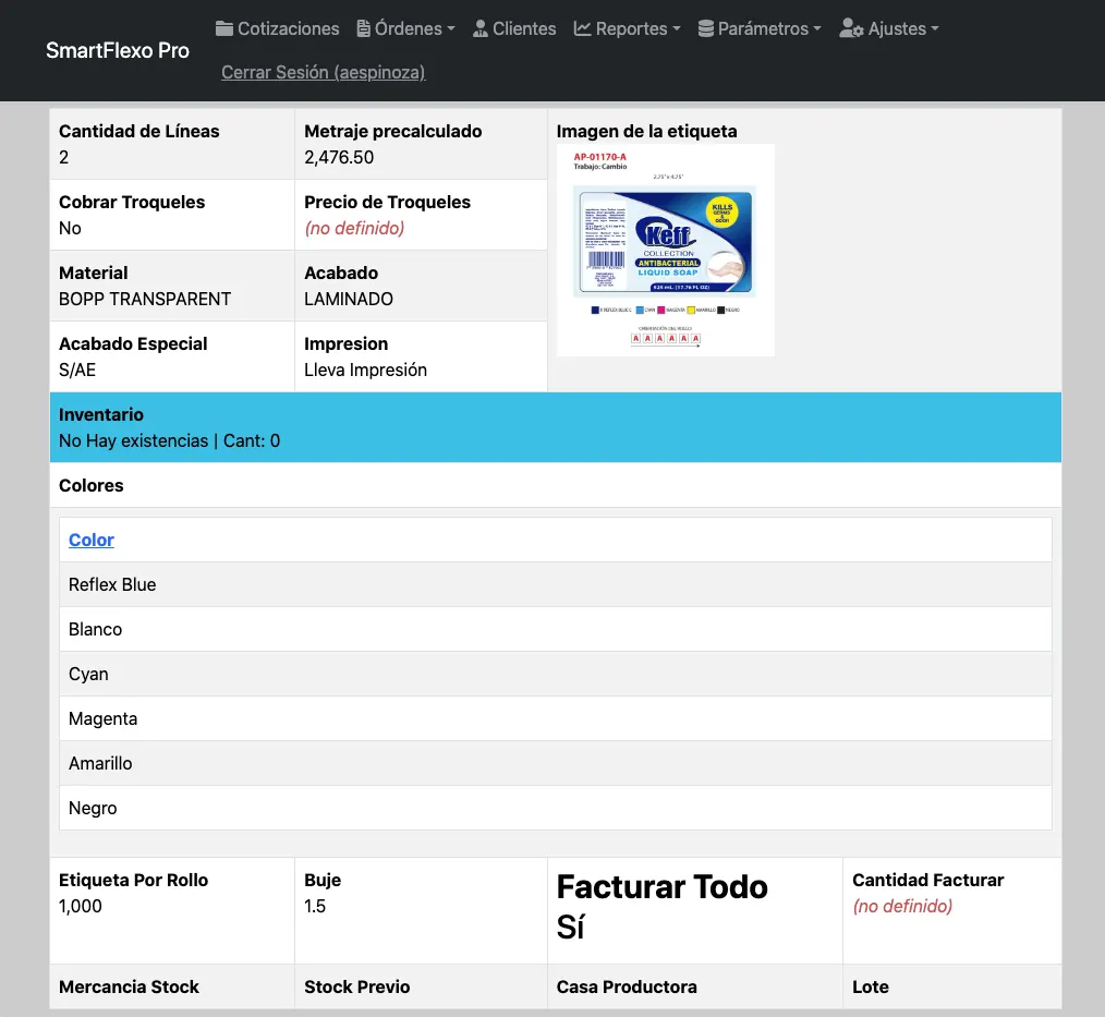 Una vez que una cotización queda aprobada, Smart Flexo Pro genera automáticamente la ODP correspondiente. Cada Orden de Producción contiene: