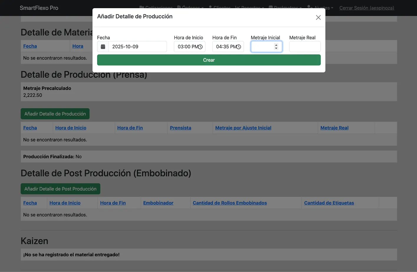 Registro operativo detallado: los operadores ingresan datos como hora de inicio y fin de máquina, metraje usado, metros de puesta a punto y materiales entregados, permitiendo un control real de tiempos y consumos.
