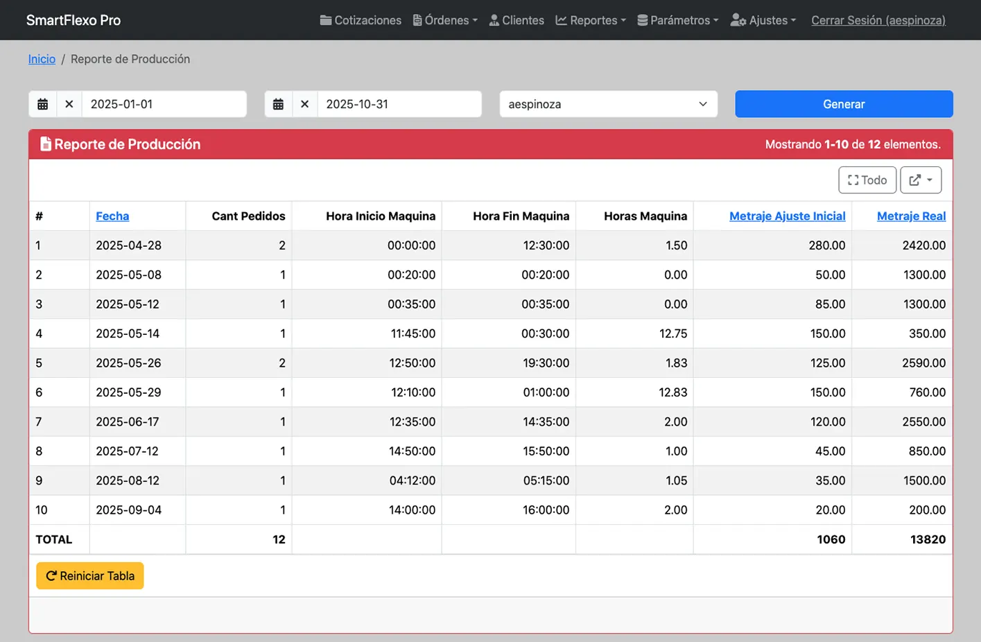 Reporte de desperdicio de materia prima: metros desperdiciados por máquina o por fórmula de tinta, para identificar áreas de mejora.